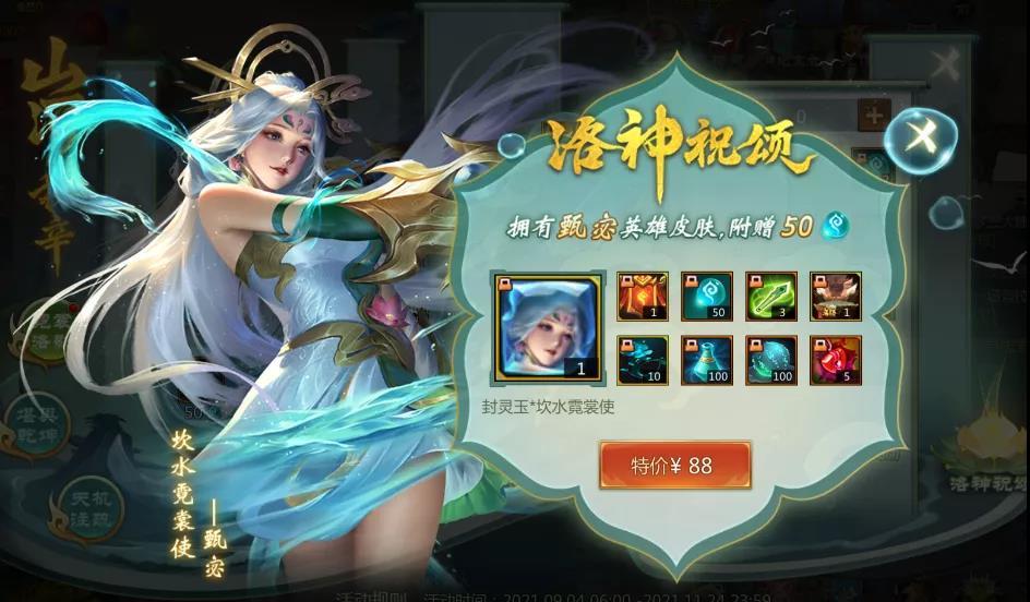 购买这个价值88的礼包后,便能直接获得甄宓的全新换装坎水霓裳使。