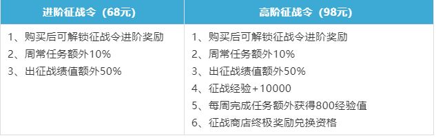 这次的全新进阶征战令一样可分为【进阶征战令】和【高阶征战令】两种类型。