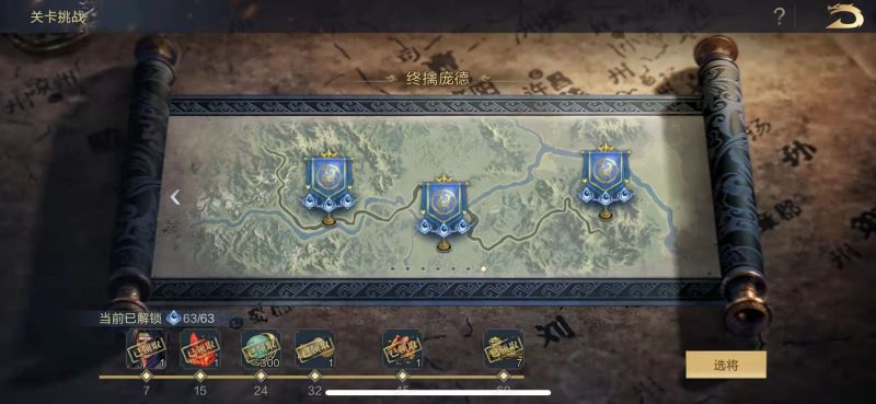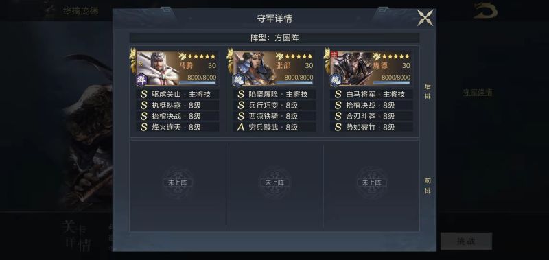 第一关双紫将前排+弓兵主将,坦度非常低,主动队或连击队均能通过,上阵2名强度适中的武将即可,使用125站位。
