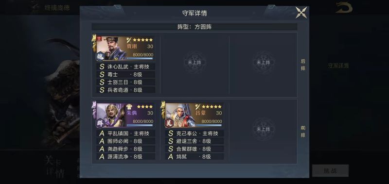 第二关守军的配置尚可,但核心武将贾诩需要大量短cd技能施展中毒触发,而该守军的配置无法实现循环,所以使用常规队伍即可通过。推荐124站位。