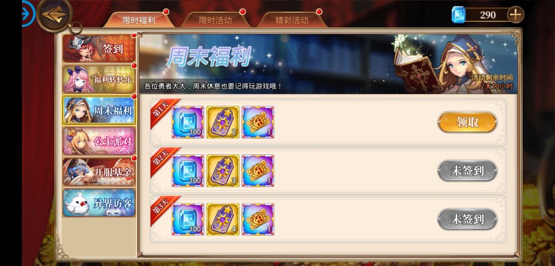 只需要每天登陆游戏,即可领取下面这些奖励哦,祝勇者大人们周末愉快!