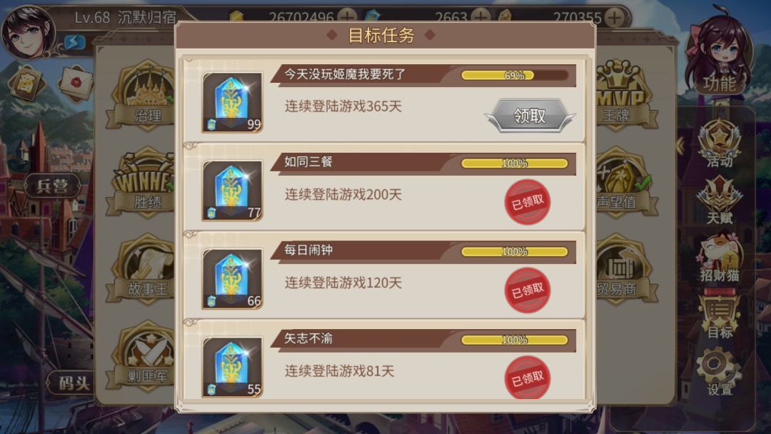 历时251天,应该算中等速度。中间各次活动都没落下在刷经验,68级才通关应该也没谁了吧。
