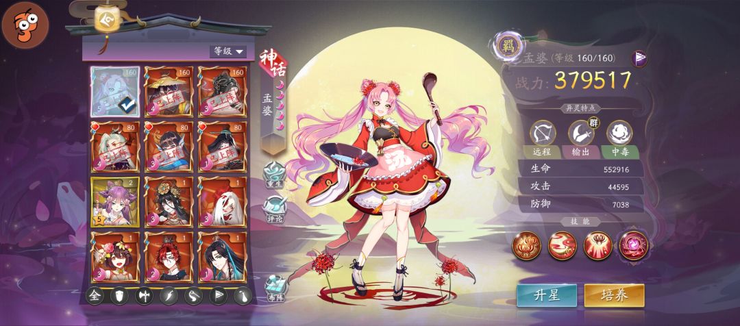 pve追求伤害虽然是菜了点。但是pvp猛呀。同练度的情况下,37w的画皮切我的38w的孟婆活不过4s,我孟婆55w血。160级,看看你们画皮的血量。一秒8%够几s,切画壁就更难了。虽然我画壁只有28w。。但是这个摆放。画皮还能打谁,现在我们区基本都带了秋,所以青竹鸦其实可以考虑换掉。但是pve青竹鸦的晕效果也很不错。不打伤害榜的。推荐这套万金油阵容,个人体感相当不错。中间3个不怎么吃练度。都是功能性的。正经也打不到。aoe肯定也打不死,主c孟婆,23培养燕赤霞画壁。孟婆好养。主堆生命然后堆防御就完了。燕赤霞堆防御,画壁堆生命。青竹鸦其实考虑可以换那个加最大生命值得治疗,但是其他功能性一般。感觉意义不大。欢迎讨论。别和我扯画皮婴宁多牛皮。画皮还能看。婴宁我用160满配。伤害还打不过当时才140的孟婆,满配的3月画皮伤害确实不错。比满配的5月孟婆要高。这不是平民资源有限。考虑到阵容的综合泛用度。还是选择主c孟婆。(毕竟同练度,画皮打孟婆就是送。别抬杠。实测。看前面。)后期资源够,可以考虑青竹鸦换个画皮?其实之前没带秋之前,用的是非衣,但是菲衣伤害简直不能看。同练度甚至差画皮一倍。功能性也一般。诅咒也不是太需要他挂。最终还是考虑下掉了非衣(心疼我婴宁和菲衣3月的石头。)阎罗是之前想着不用孟婆,用画皮c当辅助用,尝试之后体感一般。山主伤害意外的还可以(当然比不了画皮和孟婆,但是相对来说也很不错了。)但是攻速的buff也不太适合这个体系,只能说孟婆太强了。不需要攻击不需要攻速不需要暴击不需要破甲。以后pvp你甚至可以把他当个t放在后排毒都是附带的。重要的是防切吧。谁能拒绝一个又肉还巨能打的小萝莉呢。以后有更合适的角色,其实都可以下掉话壁,用孟婆一个人丢后排让刺客切就行了。不过这个阵容孟婆血量不够的时候pvp打秋的队伍确实不好打。输出全靠毒。没秋的队伍特别是刺客主c的队伍是随便拿捏的。这也说明你游整体还是不错的。相互克制。你用刺客我用孟婆,你用孟婆我用秋,你用秋我用刺客