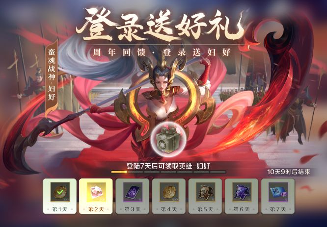 活动时间内,累计登录7天,即可获得英雄妇好。登录奖励具体如下: