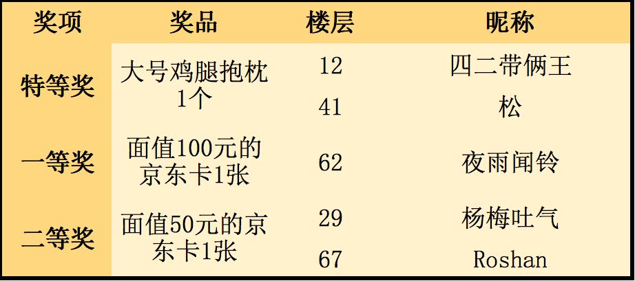 截止至11月4日中午12:00,参与活动楼层数截止至99楼,其中有效楼层共92层(已去除重复楼层及无内容楼层),共5名玩家获奖,以下为中奖名单: