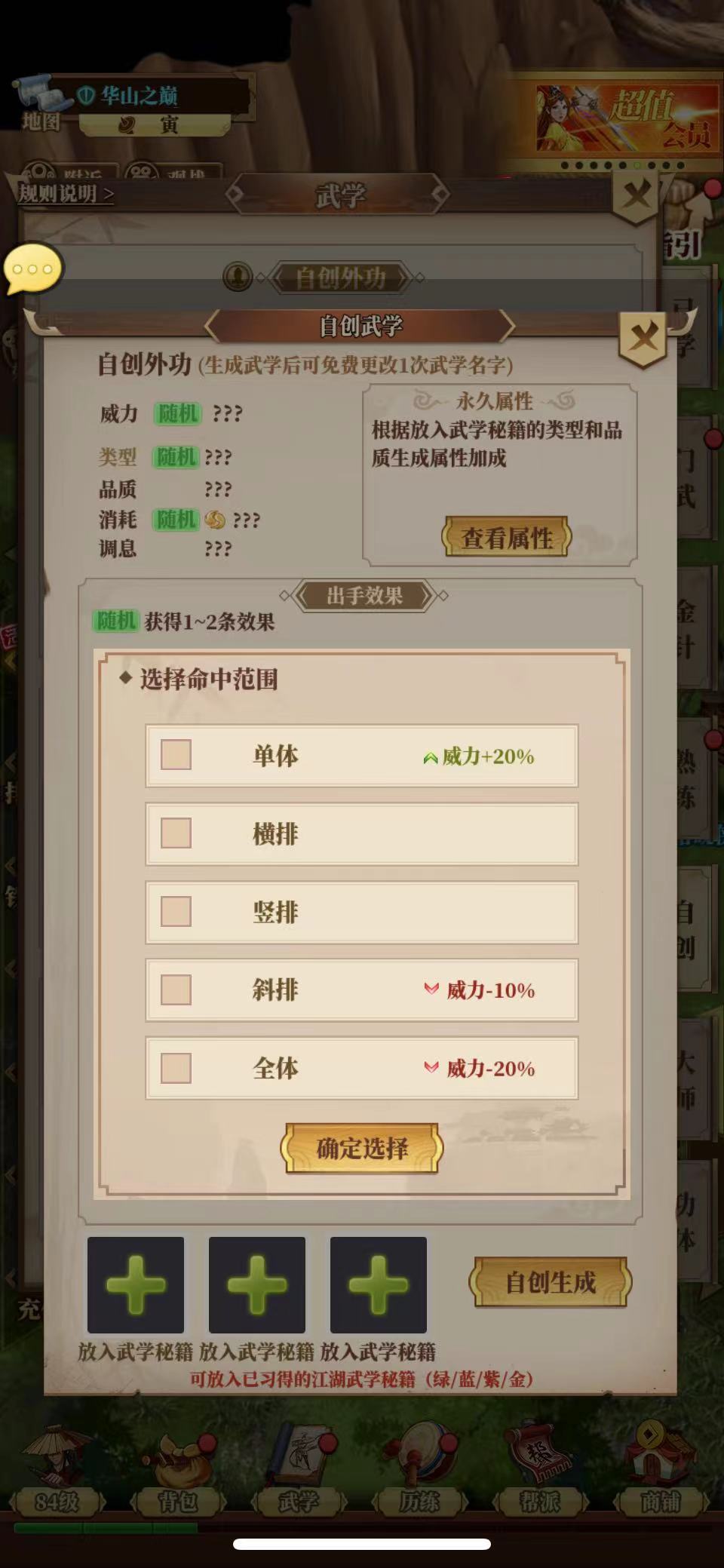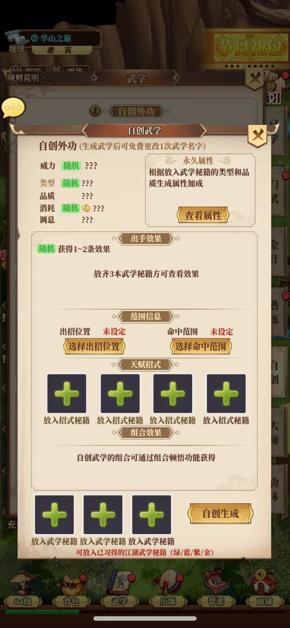 出手效果:会从你放的三本武学的出手效果中随机选1-2条,这是决定一个自创好不好最关键的地方,一个好的自创必须是有双属性的,而且双属性都必须是好用的