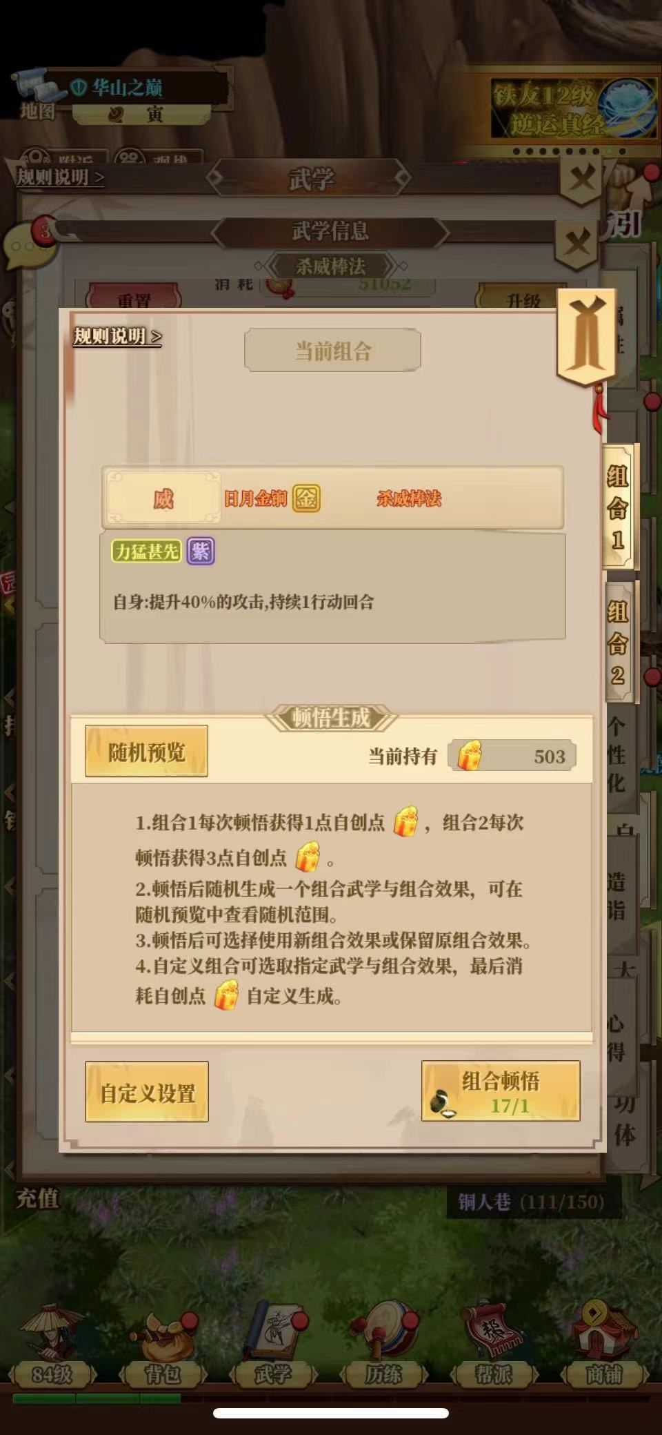 如果一直洗不出好用的组合,每次洗都会给自创点,洗多了可以用自创点自定义组合效果和组合武学。