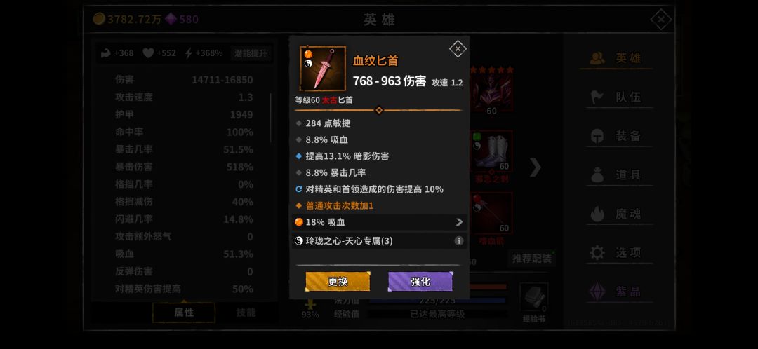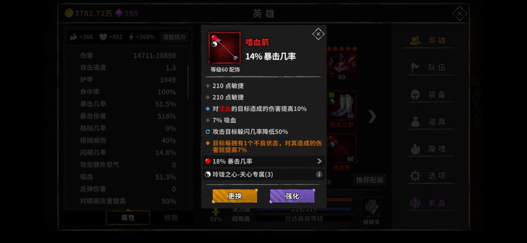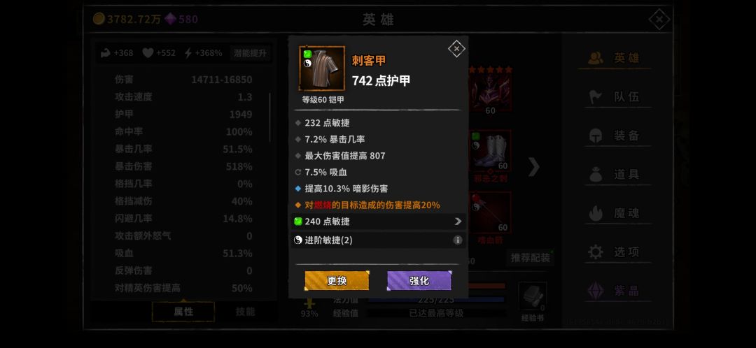 橙色大词条照抄即可,核心词条有吸血,暗影增伤,精英增伤,对流血/燃烧增伤,其次是最大伤害,暴击率,各项增幅尽量均衡,爆伤由潜能提供即可,最后注意要洗2条防闪哦!