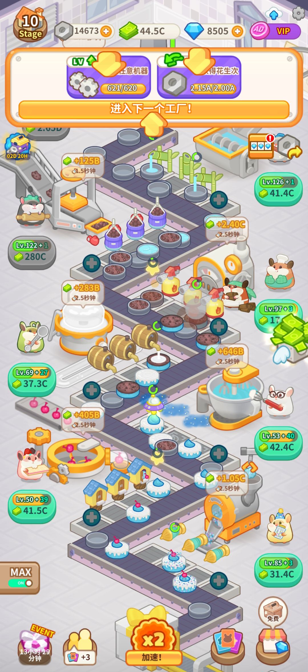 对于每个关卡重新建造工厂,姬的玩法建议是先建造一个机器,再花钱安排仓鼠员工,实现自动化生产,然后不断重复“建造机器,实现该机器自动化”,直至整条蛋糕工厂生产链都建造完成。(因为实现了自动化操作后,即使离线也可以获得收益呀~)