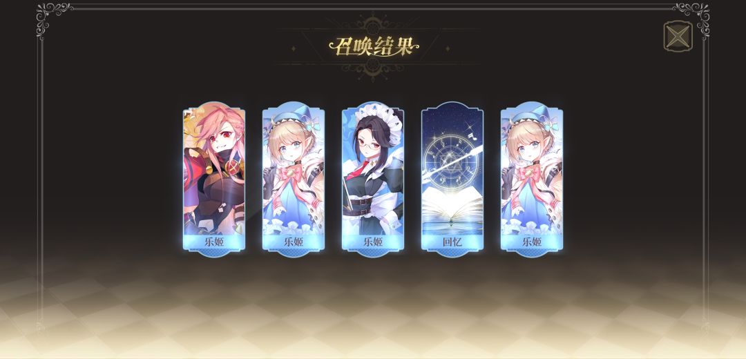 最终收获:65抽=非up的ssr乐姬x1+ssr回忆x2+紫卡x14+蓝卡x48