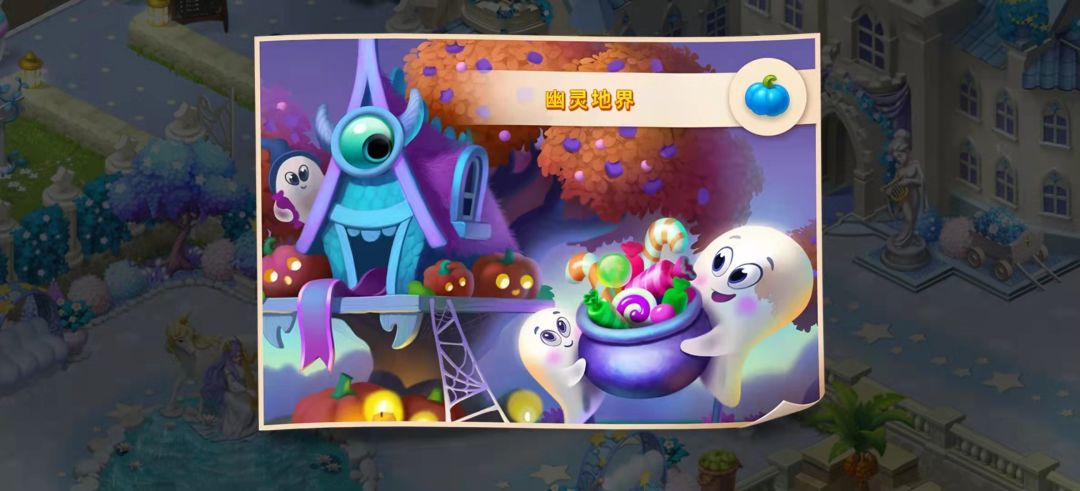 游戏界面左边箭头所指的幽灵👻图标,点击就能查看万圣节需要换的全部装饰物,此次皮肤收集的元素是南瓜🎃,收集区域分为主屋树屋区域和花园区域,分别为【幽灵地界】和【魔咒世界】。Are you ready?一起将花园打造成诡异世界吧!!!