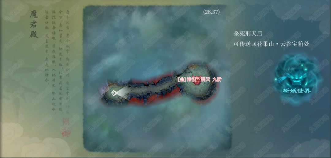 打完魔君殿九阶的boss之后会出现传送阵可以传送到花果山点云谷右上角的宝箱处~