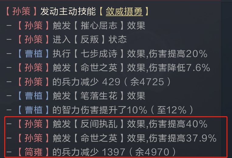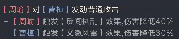 可以看到,反叛队在面对主动、连击等队伍时,既可以通过反叛造成伤害,SP庞德也可以主动出击打出不低的输出,但在面对被动队伍、高频净化队伍时,虽然曹植能保留伤害触发,但会缺少反叛带来的额外收益(增伤+减伤+反叛攻击),所以建议主公们在使用该队伍时,多选择主动队伍和连击队伍作为目标。如捷足三孙、三势祝融这类输出方式不受反叛影响的队伍应尽量避开,相信主公们经过实战磨砺后,能够研发出更强大的反叛队伍。