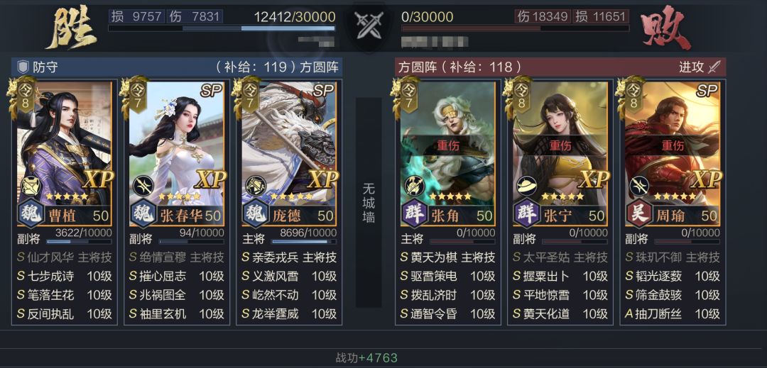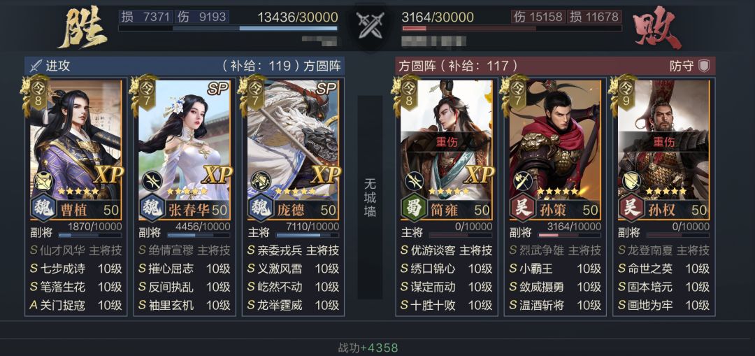 通过以上配置后,队伍可以利用反叛的获得高额的减伤与增伤,并在反叛基础上衍生出额外两种输出手段,SP庞德的主动武技(屹然不动)与曹植的被动触发,都能有效规避敌方的控制。