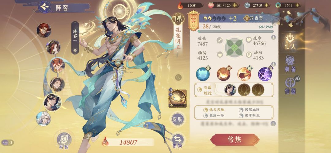 仙人定位:孔雀明王是一位攻击型仙人,上阵孔雀明王可增加我方掌教伤害,飞升后的孔雀明王会增加对方掌教灵宝技能能量消耗,佩戴专武后可沉默掌教灵宝技能。
