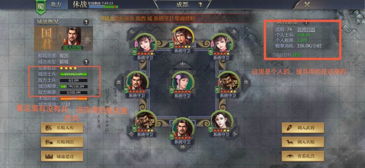 涉及兵粮的话我主要讲一下调入兵粮和兵粮入库这两个,两个按钮都在城池点进去的界面。