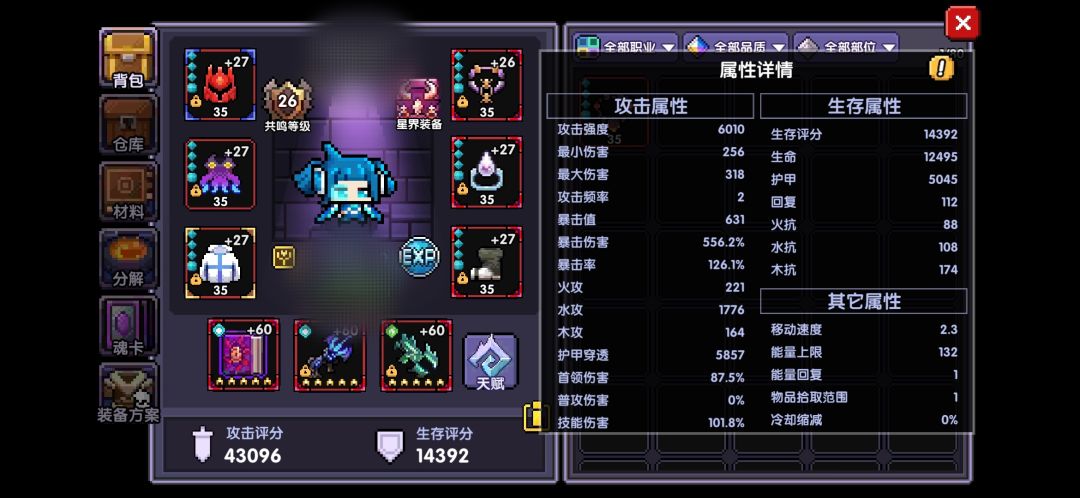 面板攻强6010、爆伤556%、属攻1770、技能伤害100%、能量值1125、伤害增幅2.3%、元素穿透1312。