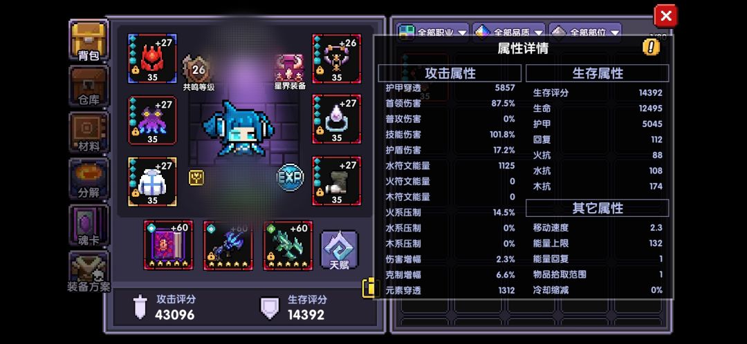 400能量和800能量的1.5是帕尔4星魂卡。400能量其实是技能伤害增加,800能量其实是水属攻总加成。我没有其他旧日技能伤害增加,没点60级天赋中的水属性加成,所以都简写了。