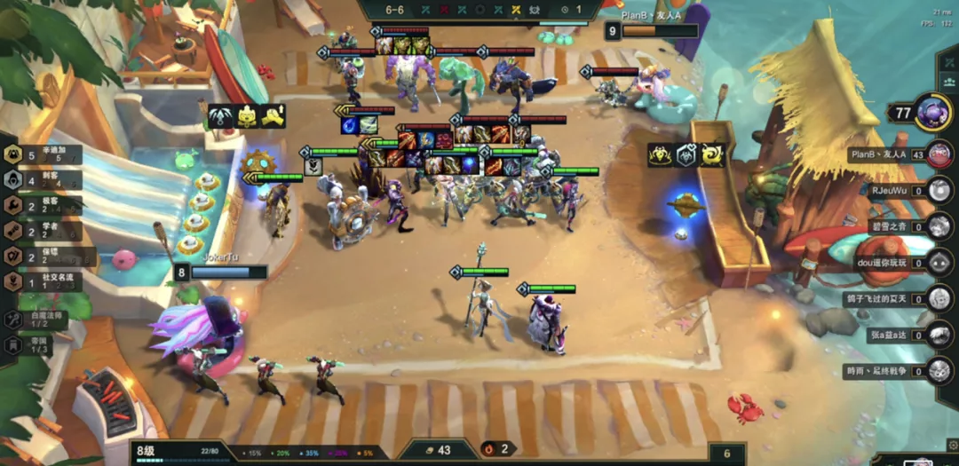 整体运营的节奏和测试服刚开始测不一样,小丑砍了2轮了,加上避免同行多,阵容的核心就是找阿卡丽,小丑主要前期稳血连胜强势,利用这一点速冲即可,比较怕7人口大D那波天谴2星小丑,兔子第五就这么出来的,那波天谴小丑就会大量亏钱,没有阿卡丽阵容就很弱,顶多靠前器连胜吃个烂分。