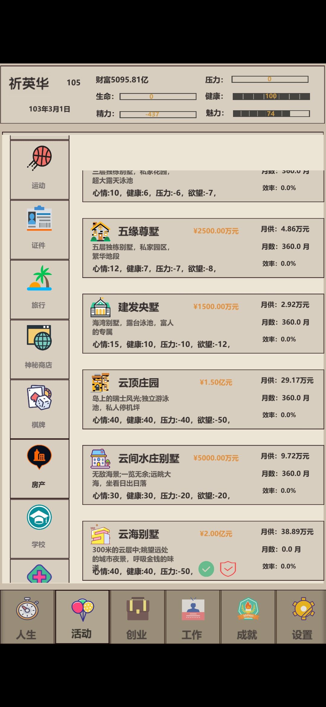 所以前期建议先刷父母亲密度拿零花钱去锻炼身体,可以上学后看家庭条件选择学校。(如果家里钱不够中途会被退学。)