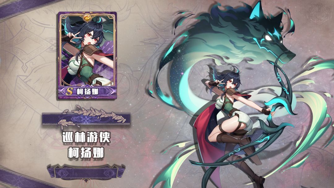 因而在柯扬娜的最新立绘中,出现了狼首与星空的元素。一身绿衣的弓箭手少女,有着森林中可与狼王齐驱的亮眼红色披风,当她奔跑起来的时候,红色披风随风摇曳,蜿蜒一地星光。