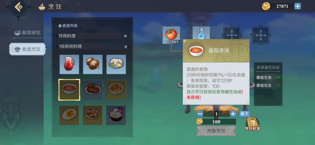 最后为大家推荐几种中亲密度,且属性非常nice的食物。首先是制作非常简单的番茄浓汤,食用后可以增加生命回复,并且免疫120秒的残废和诅咒。挑战拥有诅咒能力的BOSS之前,最好来上一碗。然后是二级厨房料理汉堡包,食用后可以立即回复高额的生命值,并且增加10%暴击几率,持续240秒。去参加战斗的时候,记得背包里要多准备几个汉堡包哦!最后还有四级厨房料理的糯米丸,糯米丸的特殊效果是可以提升20%的破坏效率,探索宝箱或者是收集材料的时候,别忘了吃上一份!