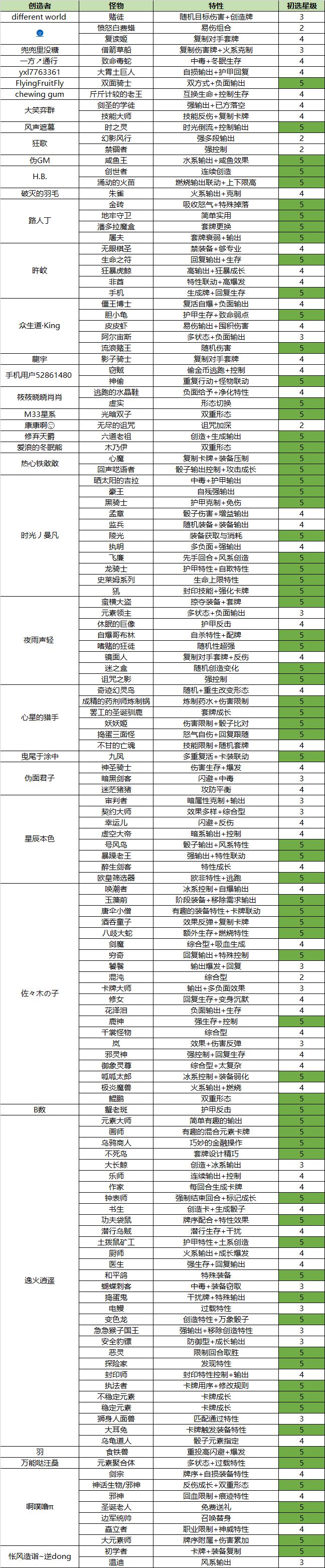 第一遍:整理每个怪物的特性和评定星级