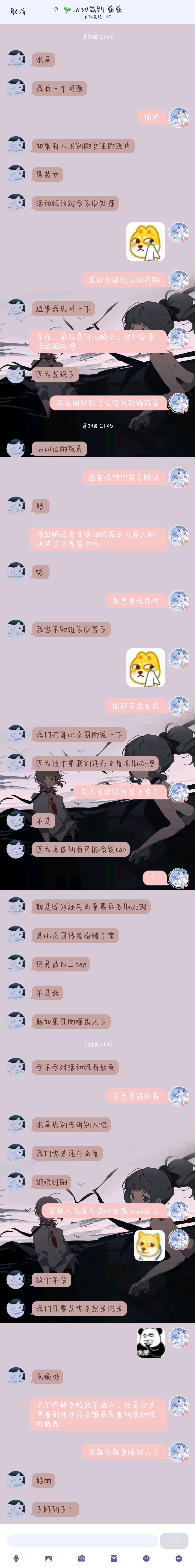 事情的起因: 11.4号晚上,蕾蕾突然找我说,有件事要给我打个预防针,我听的云里雾里,但是肯定一切建立在不危害 活动组利益。我就跟她说了一下我的看法,也相当于叫“预防针”。