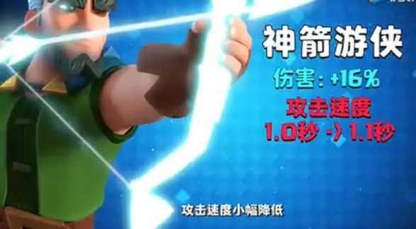 2019年8月,官方直接对游侠一波调整,将其攻速降低至1.1秒,但换来了16%的伤害提升!从原来的96提升至111,可以轻松击杀哥布林投矛手了!而其他的地方也仅只有0.1秒的攻速降低而已!虽然dps也并没有上涨很多,但是16%伤害提升也确实是看起来就得劲,桥头穿塔也能比以往蹭出更多血量!在加上同一次调整了大皮卡,用9.5%的生命值换来了远距离近战,皮卡锤在那个赛季直接重回巅峰,不少幽灵锤和黑王锤玩家将卡组中的亡灵换成了游侠!游侠的代入可以弥补皮卡锤缺乏远程的弱点,也可以更轻松地解决人海,还能在赚费时蹭血逼对面下牌,而后直接换路偷家一波!可谓是一举多得,游侠皮卡锤因此在那个赛季异常强劲!
