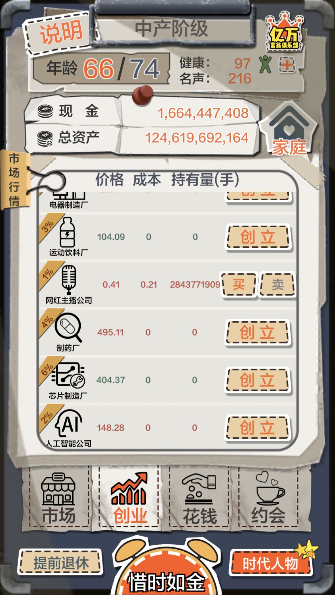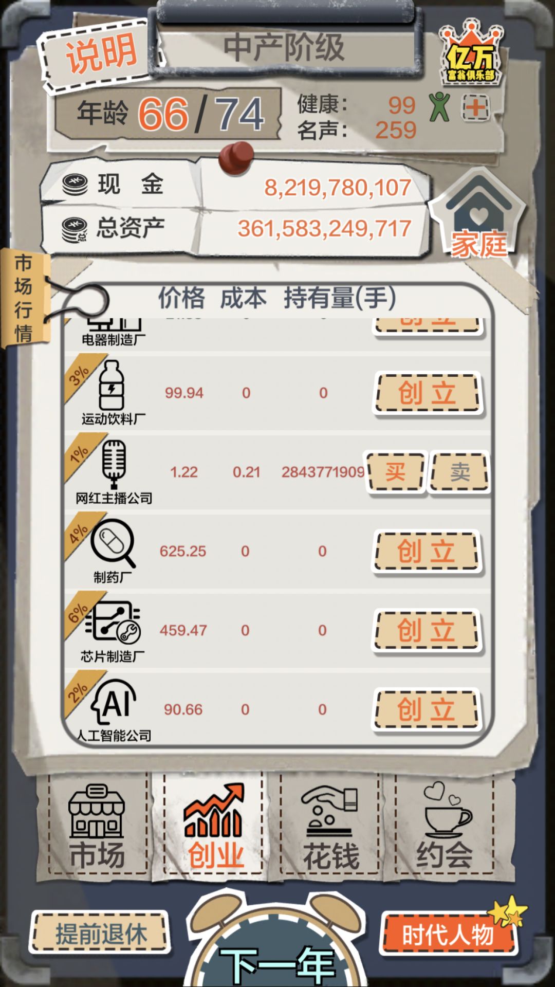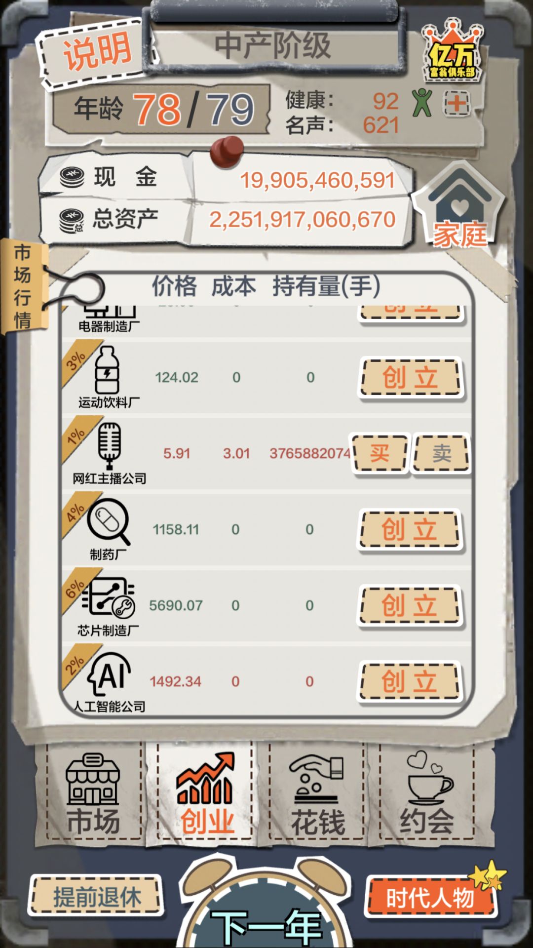 这游戏装在手机里都有些年头了,给还没怎么会玩的朋友分享一下休闲模式无脑打法吧。开局优先找低价包包(5000以下随便买),没有的话数字币狗粮也行反正目标就是先翻个倍。有个三四十万就开始刷伴侣(约会天赋满,传家宝用的垃圾怀表),目标是刷个卡亚(卡亚的作用就不多介绍了反正市场没有的商品都按购买价的三倍出售)。十万都没刷出来就果断点提前退休吧。出了卡亚就开始倒商品,前期资金少什么便宜买什么反正不会卡商品。十年基本能倒个一两亿出来了,期间有闲钱优先提升仓库容量。有钱买矿的时候优先买矿,第一个矿场都是低风险直接拉火速开采就行了,成功一次就回本(倒霉孩子别找我,反正没试过第一次就查封)。你也可以看着风险值选择采矿速度,倒腾出两三个矿以后就跟卡亚分手找中东佬马拉穆德,运气好的话三个油田同时火速中一次就有个小几十亿了把油田采封了就分手。把手里的钱投到球队里面去,能买贵的就买贵的有闲钱就升级属性然后跟桑巴宝贝艾妮塔结婚,这个时候就可以开始投股票了,球队战绩好股票上升的就快,艾妮塔还能给球队的广告收入翻倍。什么股票低价就买什么,球队上升个两三次那身价倍增的飞快(赌狗直接上网红,我就全身价两毛到13块)有些人说找三线偶像再赌网红,我就试过连续三次倒闭感觉三线偶像那概率也是抓不准。最后就是没图我说个屁呀。🌚没有开过任何修改器,全是用时间耗出来的。债见