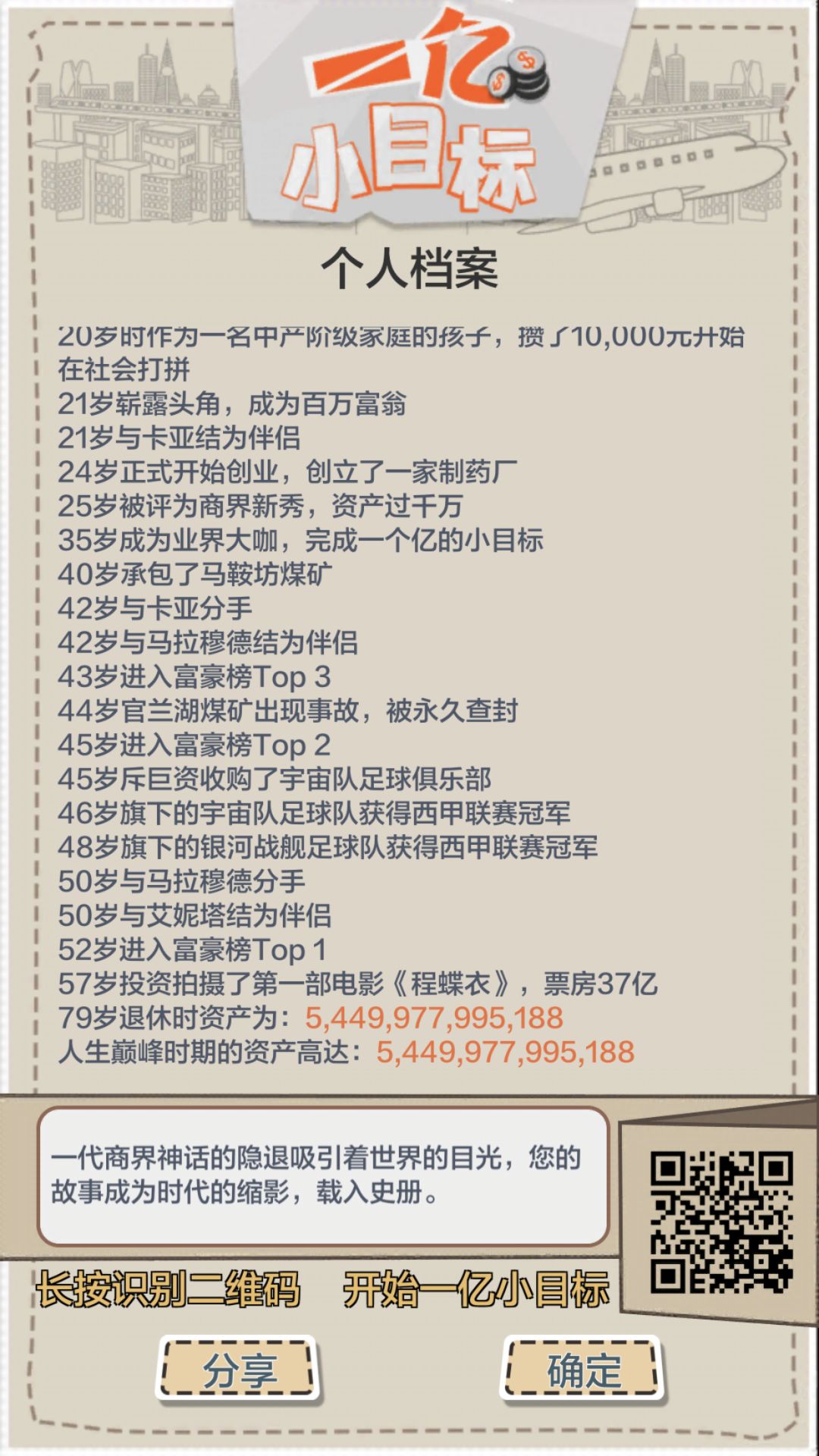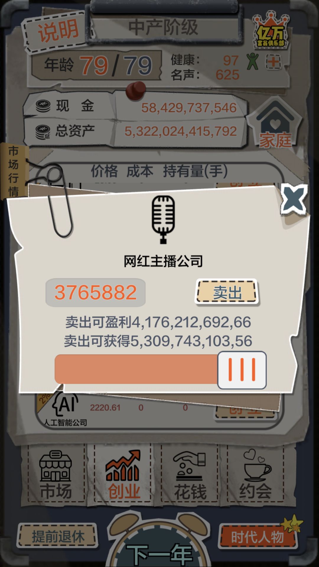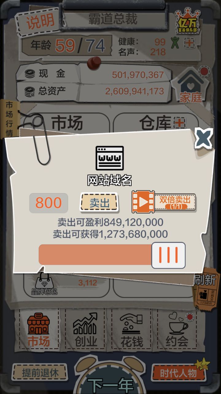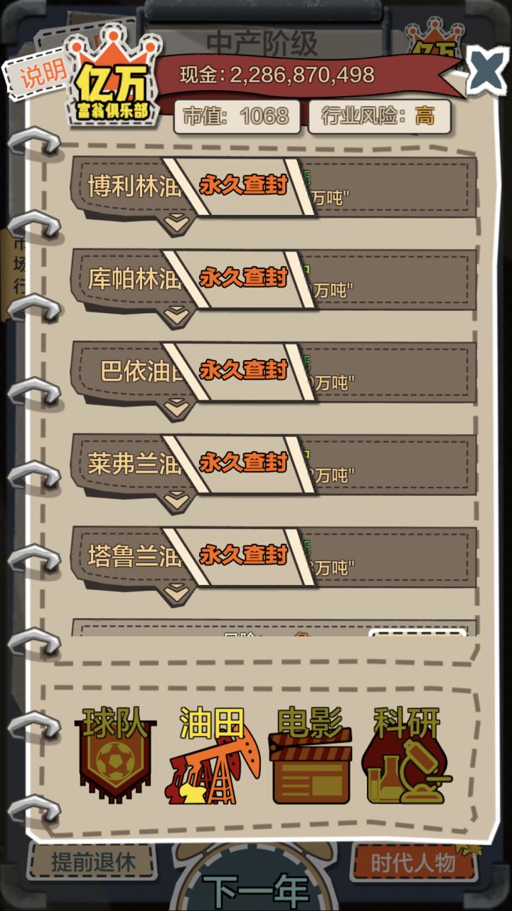 这游戏装在手机里都有些年头了,给还没怎么会玩的朋友分享一下休闲模式无脑打法吧。开局优先找低价包包(5000以下随便买),没有的话数字币狗粮也行反正目标就是先翻个倍。有个三四十万就开始刷伴侣(约会天赋满,传家宝用的垃圾怀表),目标是刷个卡亚(卡亚的作用就不多介绍了反正市场没有的商品都按购买价的三倍出售)。十万都没刷出来就果断点提前退休吧。出了卡亚就开始倒商品,前期资金少什么便宜买什么反正不会卡商品。十年基本能倒个一两亿出来了,期间有闲钱优先提升仓库容量。有钱买矿的时候优先买矿,第一个矿场都是低风险直接拉火速开采就行了,成功一次就回本(倒霉孩子别找我,反正没试过第一次就查封)。你也可以看着风险值选择采矿速度,倒腾出两三个矿以后就跟卡亚分手找中东佬马拉穆德,运气好的话三个油田同时火速中一次就有个小几十亿了把油田采封了就分手。把手里的钱投到球队里面去,能买贵的就买贵的有闲钱就升级属性然后跟桑巴宝贝艾妮塔结婚,这个时候就可以开始投股票了,球队战绩好股票上升的就快,艾妮塔还能给球队的广告收入翻倍。什么股票低价就买什么,球队上升个两三次那身价倍增的飞快(赌狗直接上网红,我就全身价两毛到13块)有些人说找三线偶像再赌网红,我就试过连续三次倒闭感觉三线偶像那概率也是抓不准。最后就是没图我说个屁呀。🌚没有开过任何修改器,全是用时间耗出来的。债见