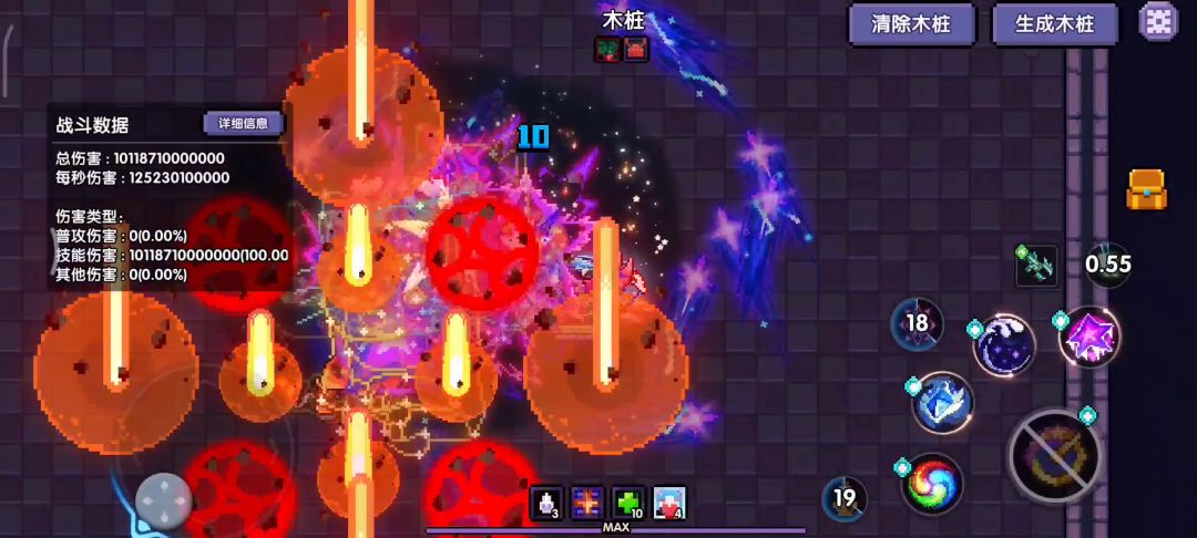 技能开启后会出现很多星星,呈逆时针旋转环绕自身,敌方被击中星星的数量越多,受到的伤害越多。所以,在面对单个目标时(比如boss和木桩),如果自身移动顺时针绕着目标转,则会让更多星星快速击中目标,是站立不动对目标造成伤害的近乎2倍!