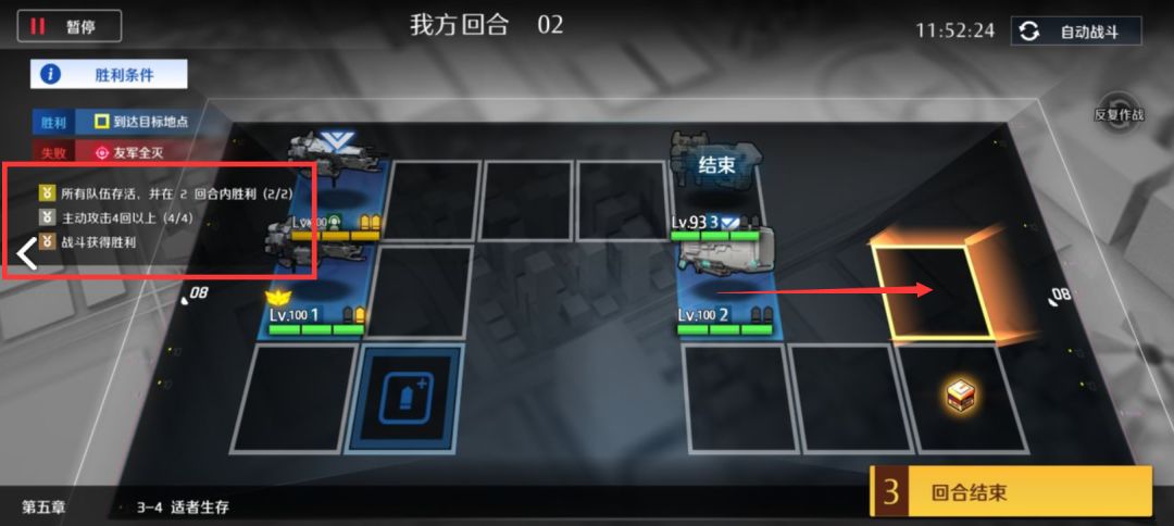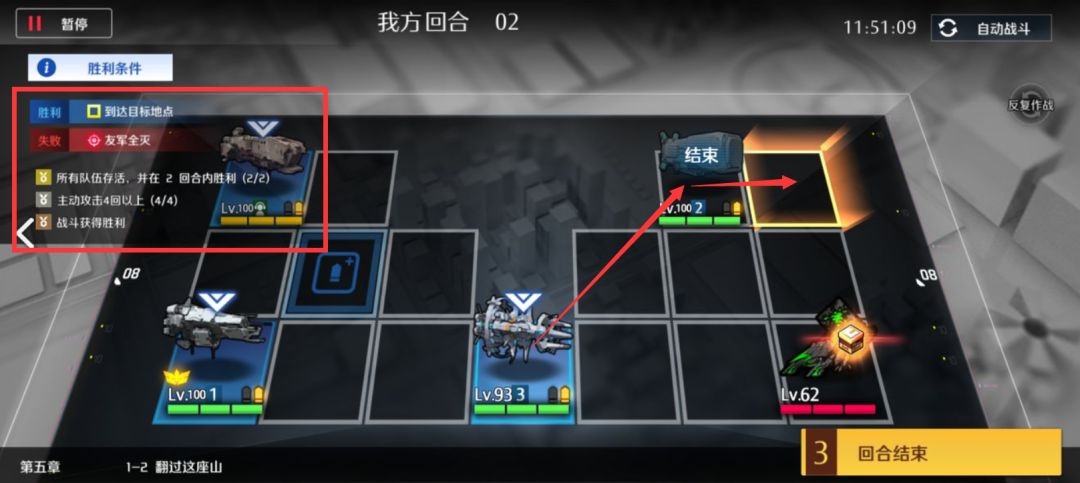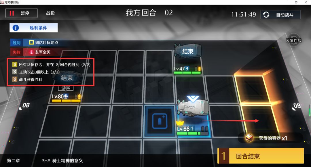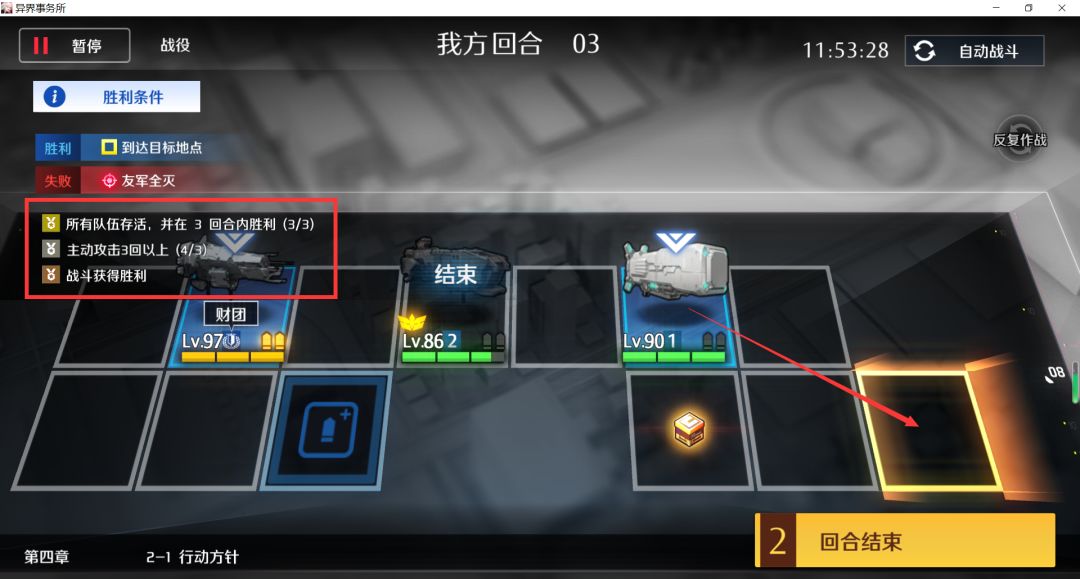 第二回合左边的重装和吃完怪的支援队交换,再右移两格吃怪,主动+1