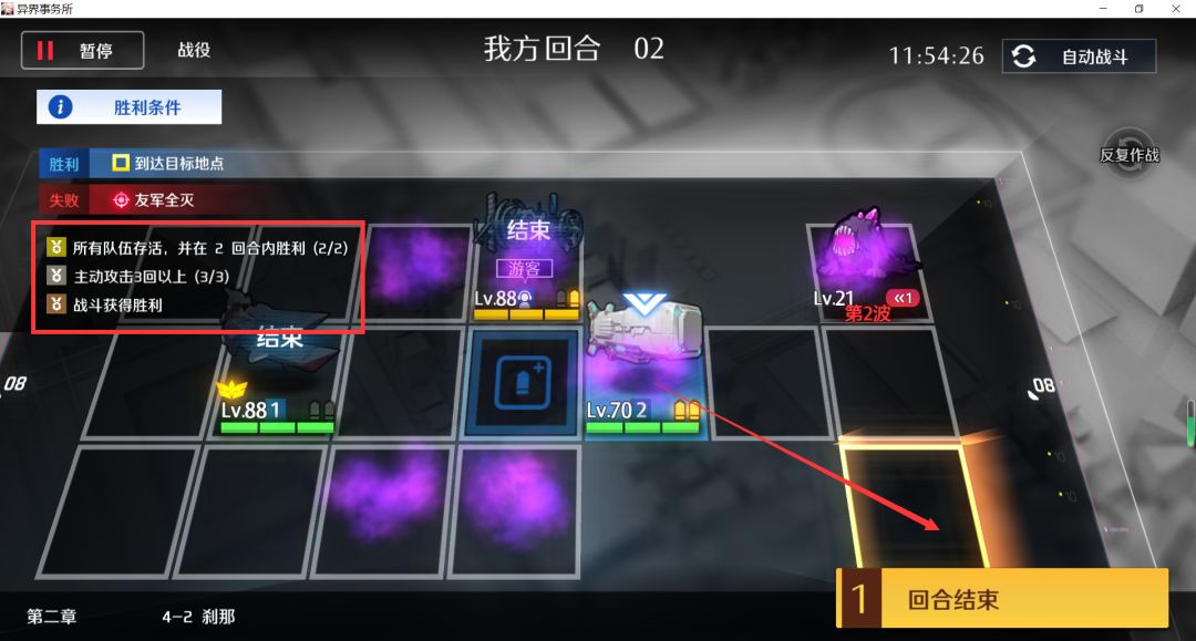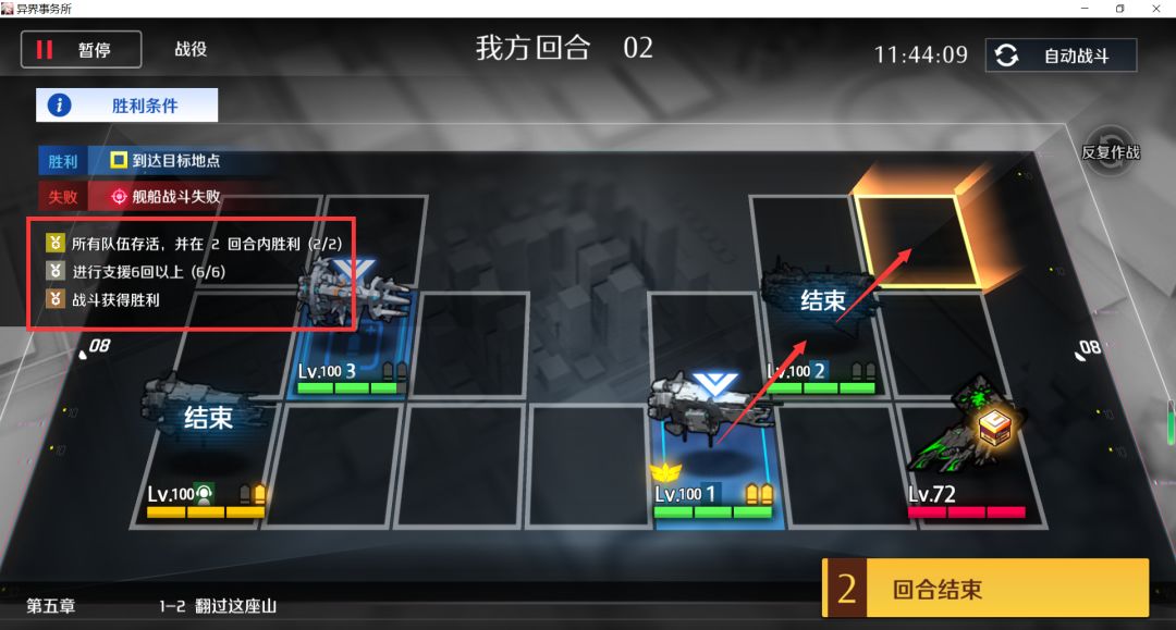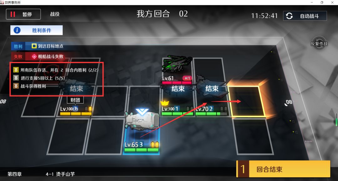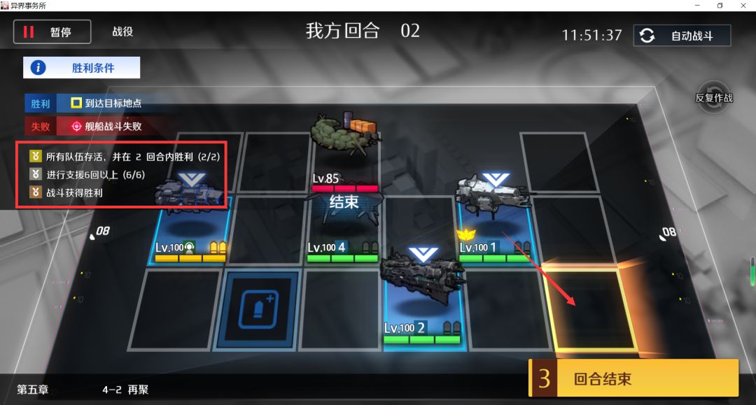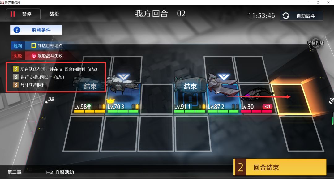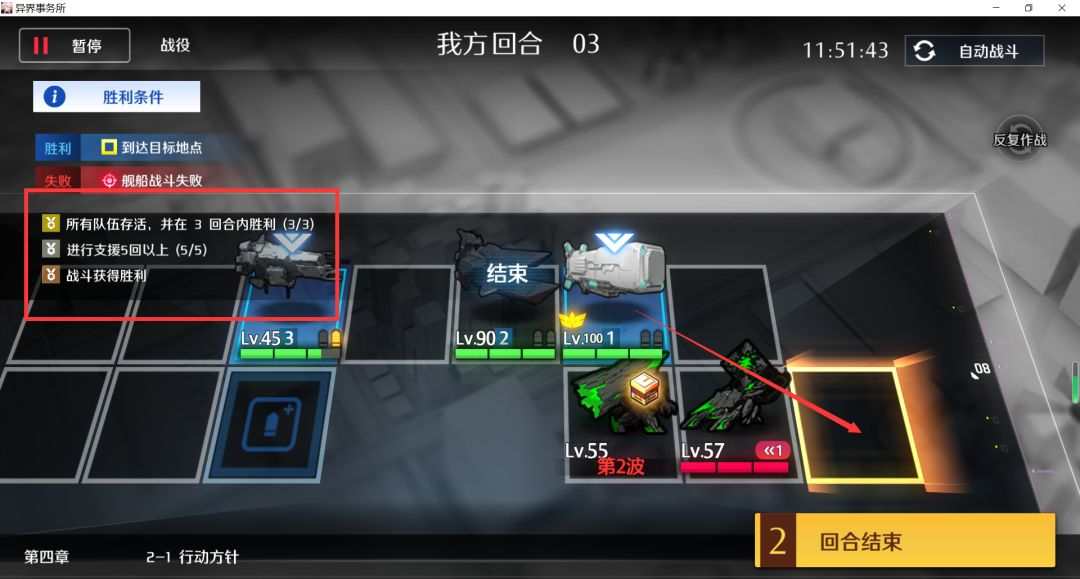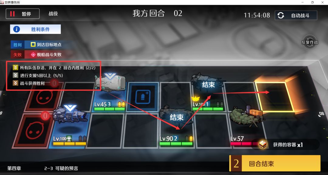 剩余两个目标怪左右各一个,没弹药的舰队换到中间,其他两支舰队各剩1弹,各自上移打完结束,支援+2