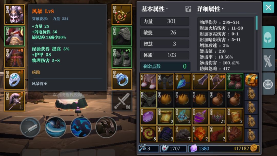 ③加点及副属性推荐:因为本人的手残属性,所以我推荐加点是全力量(没想到吧😄)和3力1体搭配(不想死的快,还得肉一点),副属性推荐:体质>护甲>最大生命值>范围伤害,因为大旋风二人转流可以做到全屏拉怪然后一波清,进去怪堆所受到的伤害基本为物理,需要一定的血量和护甲保证自己的血线安全,体质最好但是胚子较少,可遇不可求,范围伤害因为大旋风攻击频率高,触发几率高,可以选择堆叠,伤害爆炸;防御忽略推荐叠300左右就行了,大多数怪没有这么高的护甲;很多朋友就会问了,暴击呢?叠暴击伤害不是伤害更高吗,我只能说你技术高可以,我是手残,力敏暴毙的可能性接近百分百,我的攻略只适合像我一样的手残党,大佬请忽略!