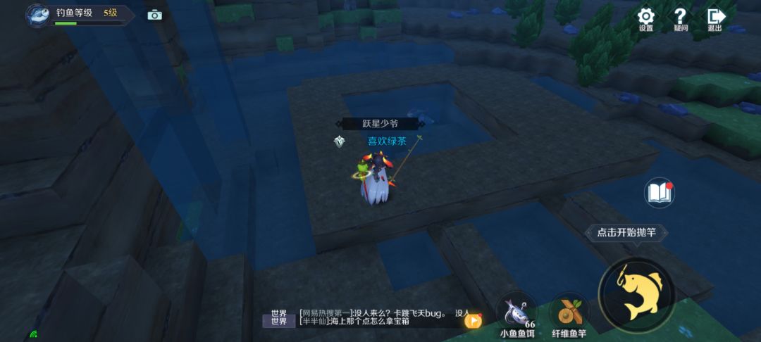 首先找到鱼塘,鱼竿和鱼饵准备好,鱼饵上面写有能钓到什么鱼(鱼的掉落也看地图的)