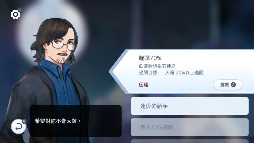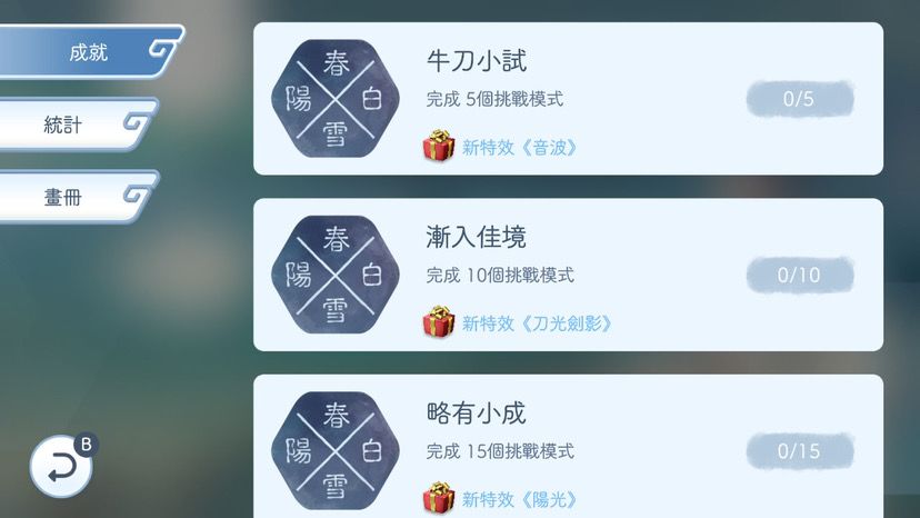 ns版没有货币系统,完成歌曲的奖励改为升级所需的经验值,部分歌曲需要达到一定等级后才能解锁。没有玉石,自然也就没有头像系统,人物主题和打击特效改为完成特定的成就解锁。《阳春1》中的特效需要完成一定数量的挑战模式才能获得,挑战模式是ns版用来代替每日活动的玩法,不限次数,过关目标固定。《阳春2》中的挑战模式即为填诗,特效则是开局全解锁,不需要额外去肝。ns版的宗师谱直接开放,稀世谱需要宗师谱达到95w分解锁。
