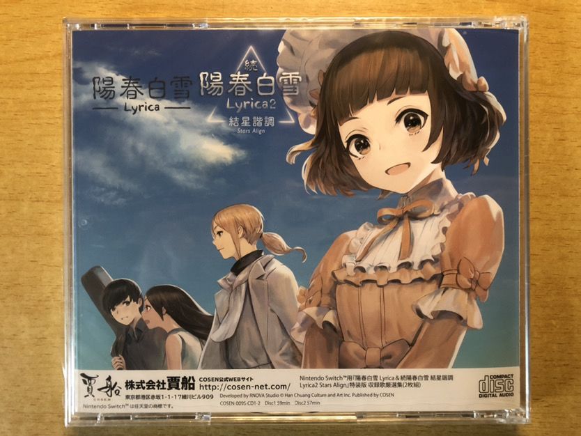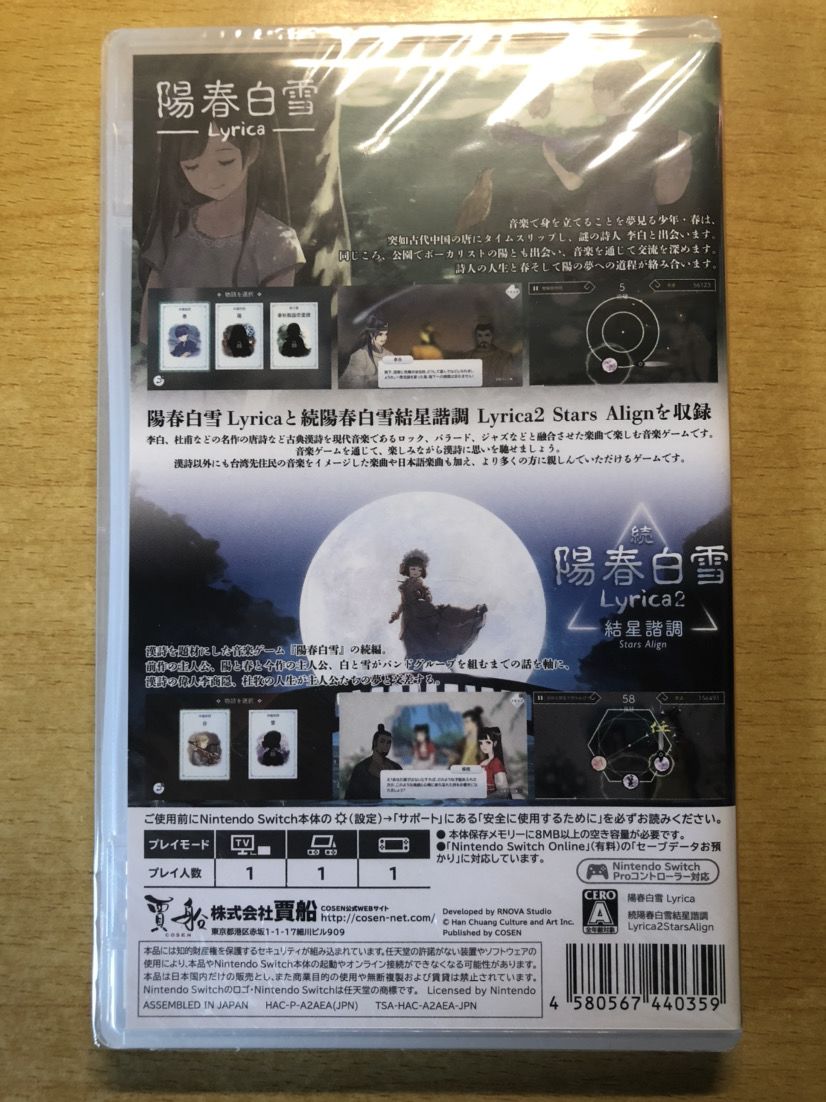 卡带盒的封面是另一张全新插画,背面也是游戏介绍,与特典版外包装的背面基本相同。卡带盒与外包装的侧面都印着卡带中两个游戏的日文名与英文名,以及发行商“贾船”。这里要说明的是,阳春ns版共发售了两次,第一次是2019年3月28日发售的数字版《阳春白雪》(以下简称《阳春1》),第二次则是2021年10月7日发售的《续·阳春白雪 众星交会》(以下简称《阳春2》),与数字版《阳春2》同时发售的实体版是包含了《阳春1》、《阳春2》两个游戏的合集。