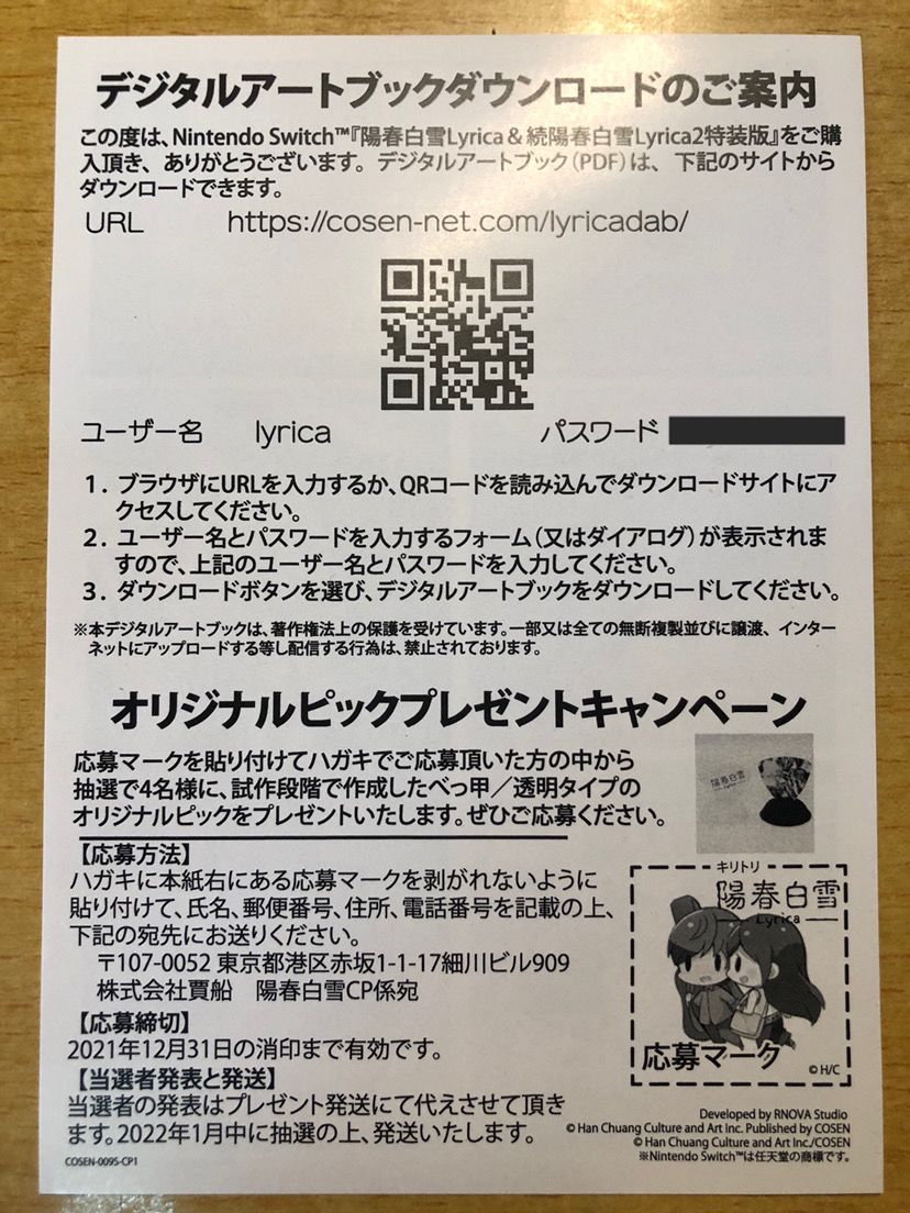 然后是我自己在到货前最期待的特典——美术设定集。包装盒内提供的是设定集的下载密码纸,上面印着下载链接以及登录所需要的账号密码(下图已打码处理),背面是贾船开发的另外五个游戏。