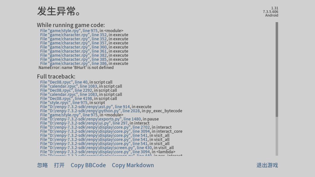 2.进入第8天最后一节(珀雷仓库)时,偶尔会出现bug页面(图1),这个好像别的玩家也反馈了。不过点【忽略】能够继续玩下去。