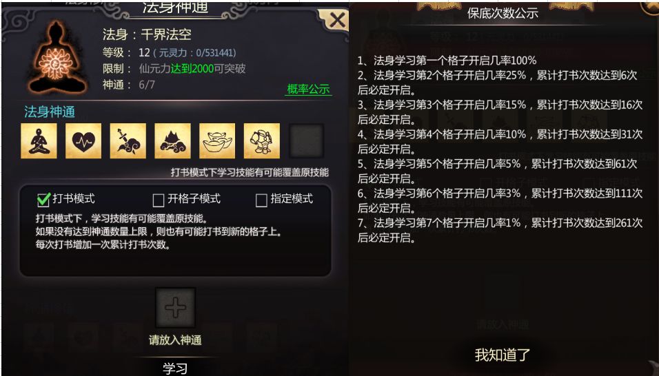 (3)神通打书:如果是刚刚开始学习神通,建议开孔也用打书的模式来开,会节约很多的仙晶开孔。一定要先打低级神通,最后用需要高级神通替换,千万不要打不需要的高级神通,没用的高级神通可以分解。神通打书模式是用需要学习的神通随机替换法身和金身已有的神通,但是有一个规则,高级神通优先替换覆盖低级神通,如果学习的是低级神通,那么就是随机覆盖已有的神通。所以在开了5孔以后,如果暂时没有灵石或者不想再花灵石在神通上,建议按下面推荐的神通进行学习,要不然学错了高级神通想替换的话,代价非常大。