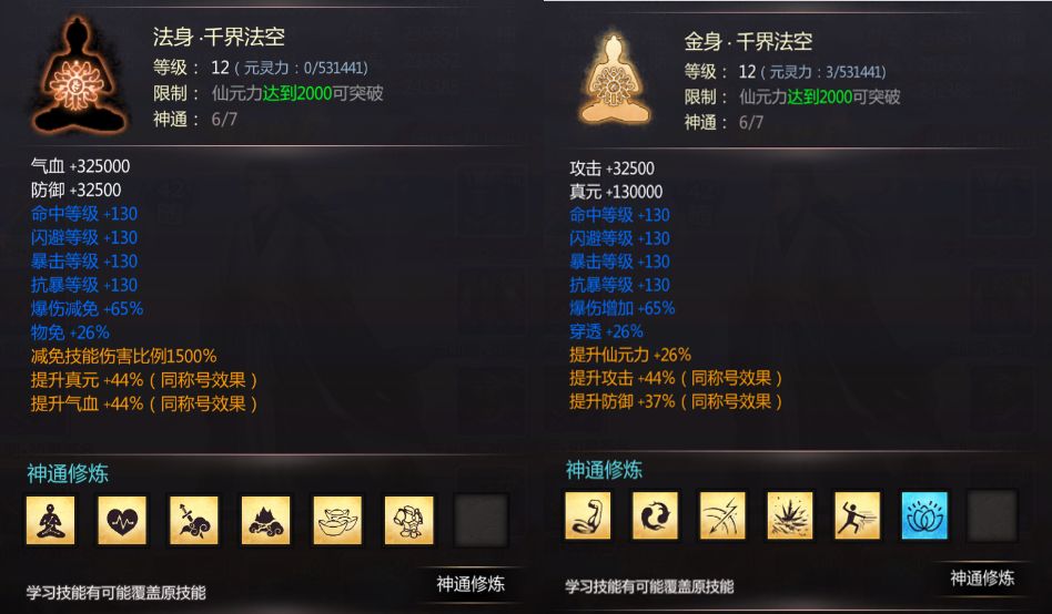 5、法身:法身主防御,特别是减少技能伤害比例非常变态,不升级法身的话,在仙界简直寸步难行,升级法身需要修为和天珠(仙界探索地图打怪获得)以及混元天晶,资源足够的情况下升级到11级比较好。