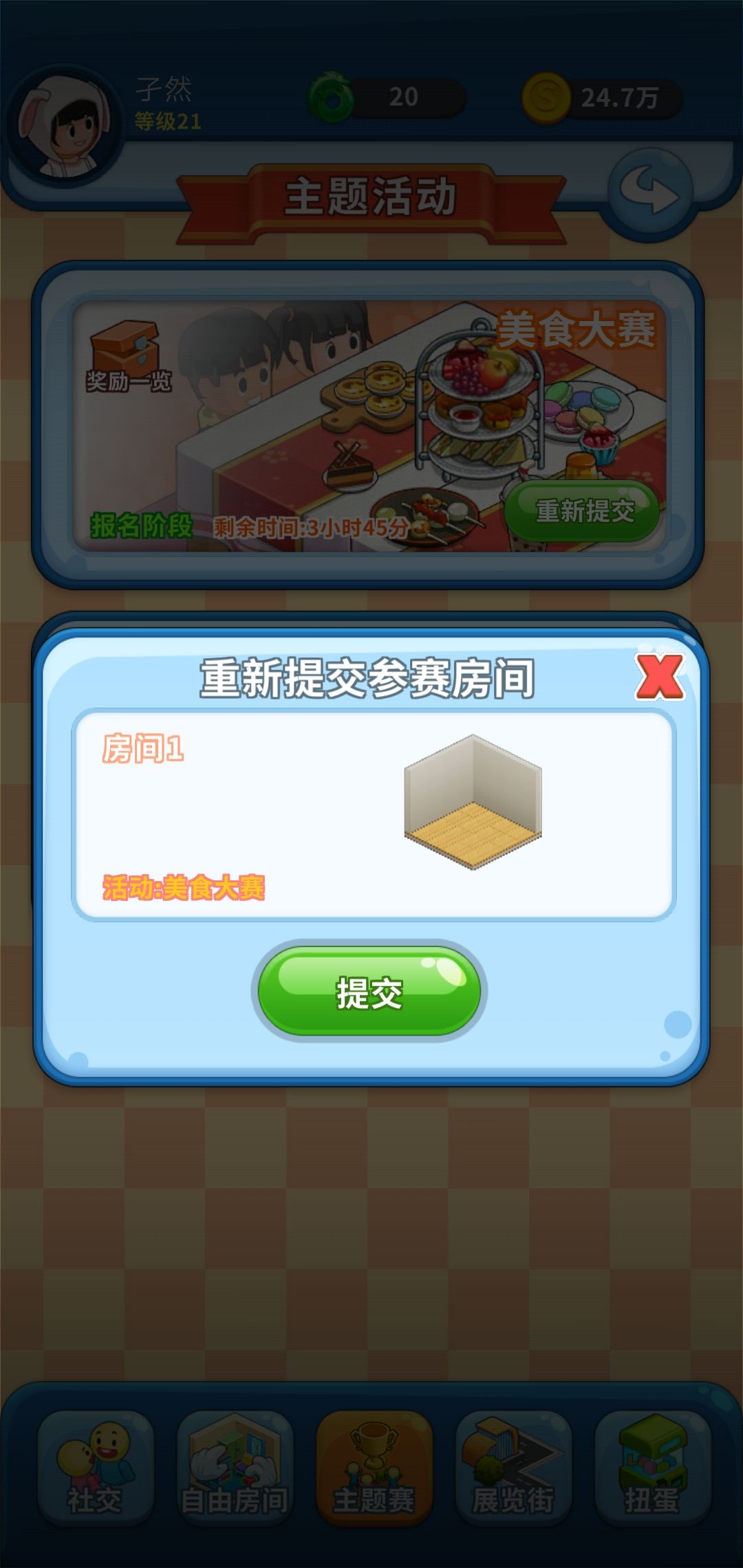 刚刚玩游戏 想着重新布置房间参加主题赛 但是却发现没有办法选房间 是我的操作问题嘛 主题赛选择参赛的房间不能更换 我这就很伤了 我弄了一个小时的成果却没有办法参加 还花了好多绿币扩的房间 我现在只能先保存的以后参加 所以我觉得很难受 还有就是主题赛的排名 每个玩家都希望能够随时查看自己的排名 自己得了多少赞 有哪些不足 而不是只是为了获得那个寻宝币去的随意投票