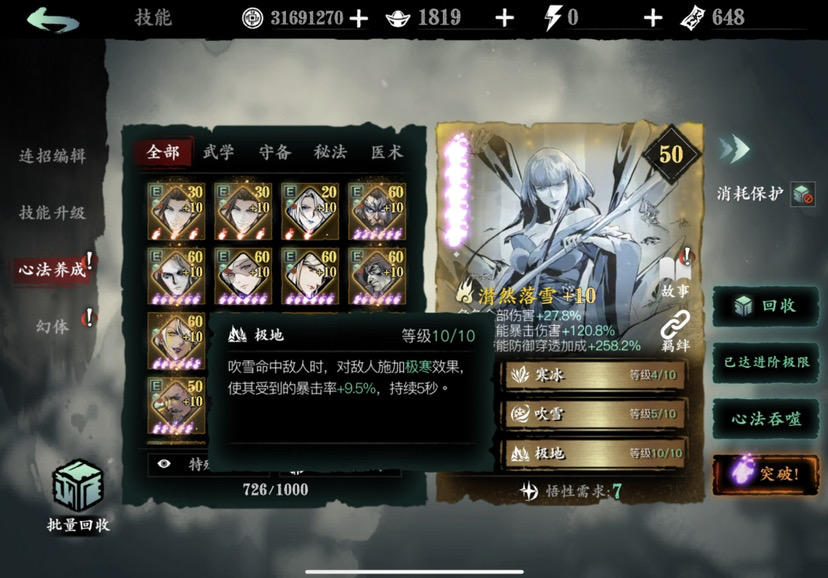 雪女绝技三是终爆(这个已经和灵游坊工作人员确认过了)珍藏紫五加9.5%,珍藏紫六是10%。羁绊嘛……只能说聊胜于无,荒魂是所有技能都有70%概率触发,触发荒魂之后再打出一个消耗杀意的技能就会引爆(这个消耗杀意的技能不管吃没吃到杀意都会引爆荒魂)~引爆荒魂会造成1000%攻击力伤害+5秒150%全伤加成。