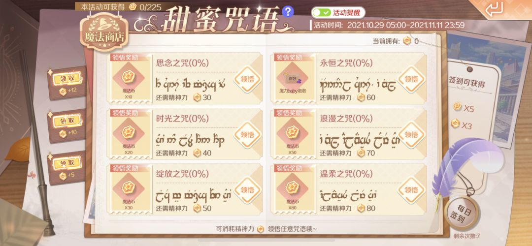 截止至11月11日,参与甜蜜咒语活动就送魔法币&聊天气泡奖励哟!