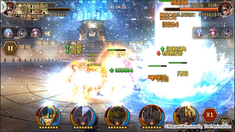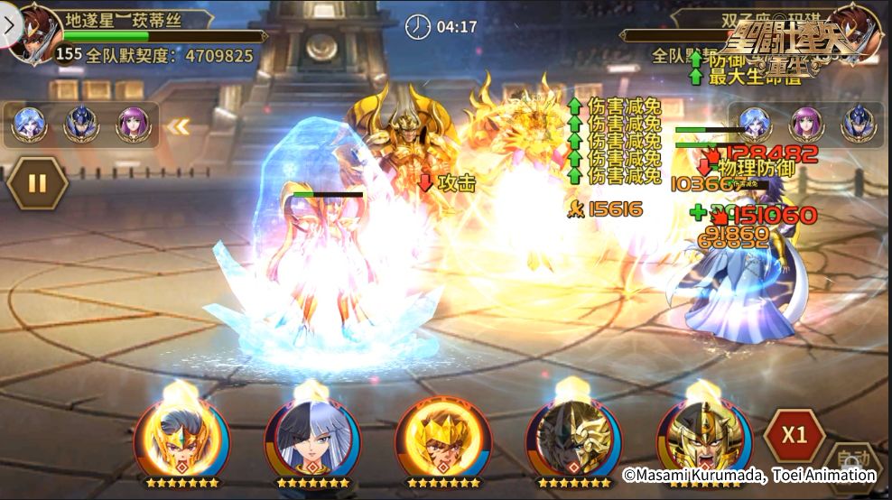 对方阵容:传说圣斗士·星矢、白羊座·贵鬼、冥衣·撒加、神圣水瓶座·卡妙、北欧圣女·希露达