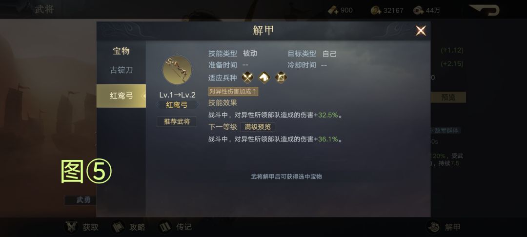 但如果对方的阵容全是刘备、赵云等男性武将,想要最大输出,红鸾弓就是很不错的选择,满级高达65%的伤害加成,配合后输出能力提升还是十分可观的(图⑤作为参考)