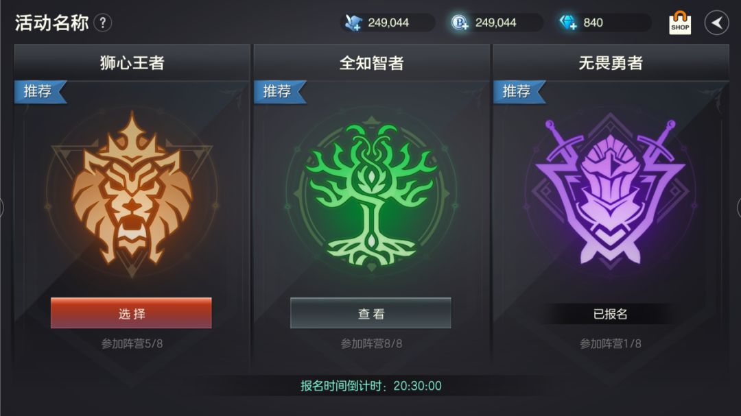 报名准备阶段将会持续多个小时,会长或副会长可以选择狮心王者,全知智者,无畏勇者中任意一个阵营进行报名,三个阵营为敌对状态。