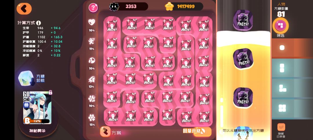 曼吉斯,讲个套路,用煤球棒,人物方糖就用全生命,煤球棒用双爆,宠物带个灯,再带个打ca,如果有奶糖带奶糖,煤球棒也容易获取,就算减了点,输出也依旧很强,想死还死不了,当然也有正规输出方式,我这个有点偏门,所以不太推荐,不过可以以后当个玩具,实在没办法,就拿他当c,带技能强度,然后选用下面适配的武器。