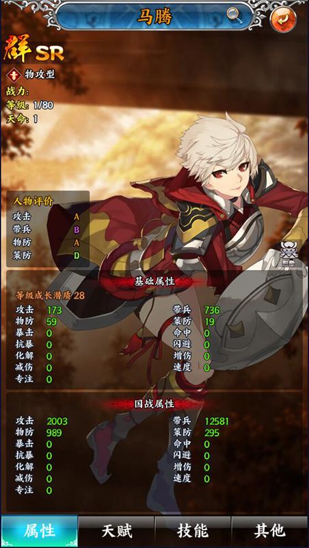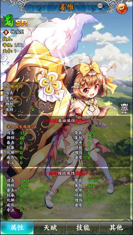 关平、关兴、姜维、孟获、祝融、张星彩。蜀国阵营就比较偏物攻强化型了,关平、张星彩物攻、防御均有A阶成长。姜维物防更是有S级成长。关兴也有物攻、防御、带兵全面A阶成长。孟获的防御、带兵双A阶成长也保证了自身足够的厚。祝融虽然属性平平,但是与孟获及张星彩两人均有羁绊加成。多重加成之家使得蜀国阵容的物理输出十分强大。